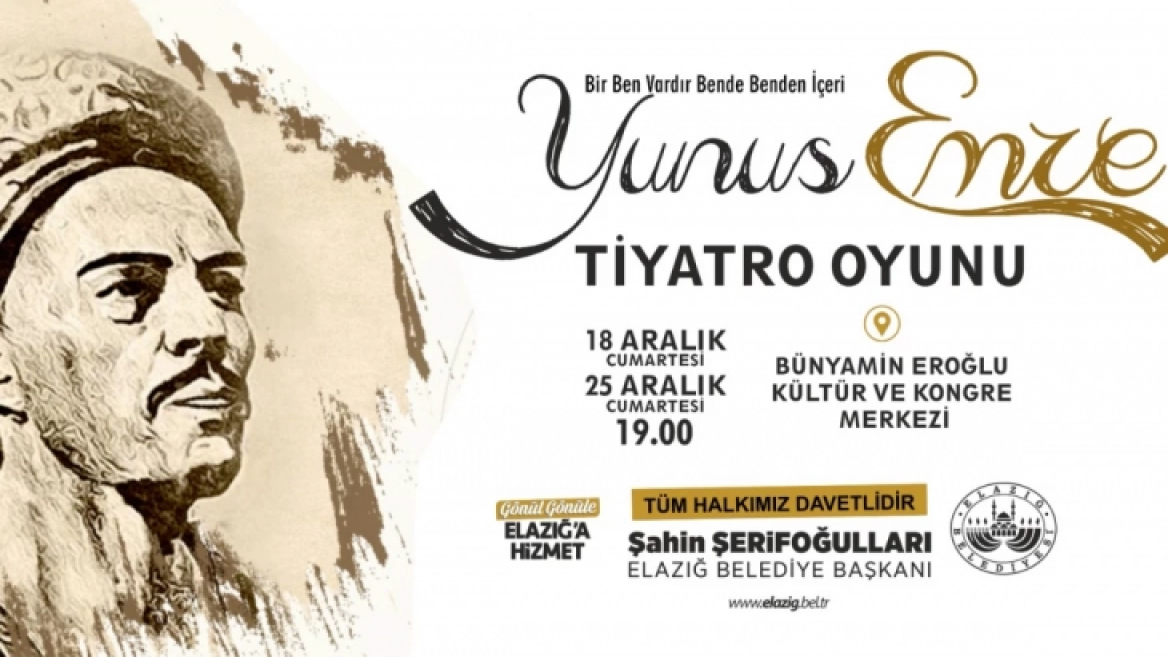 Elazığ Belediyesi Basın-Yayın ve Halkla İlişkiler Müdürlüğü’nden yapılan açıklamada, “Türk dilinin ve kültürünün en önemli şahsiyetlerinden olan Yunus Emre'nin vefatının 700. yıl dönümü olması münasebetiyle “Yunus Emre” adlı oyun 18 Aralık Cumartesi ve 25 Aralık Cumartesi günlerinde saat 19.00’da Bünyamin Eroğlu Kültür ve Kongre Merkezi'nde sahnelenecek. Ücretsiz olarak izleyici ile buluşacak tiyatro gösterimine tüm hemşehrilerimiz davetlidir.” denildi.